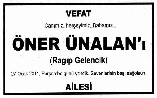 gazetesine verilen ölüm ilanı (Cumhuriyet (gazete), 29 Ocak 2011, Cumartesi, s. 14.).
